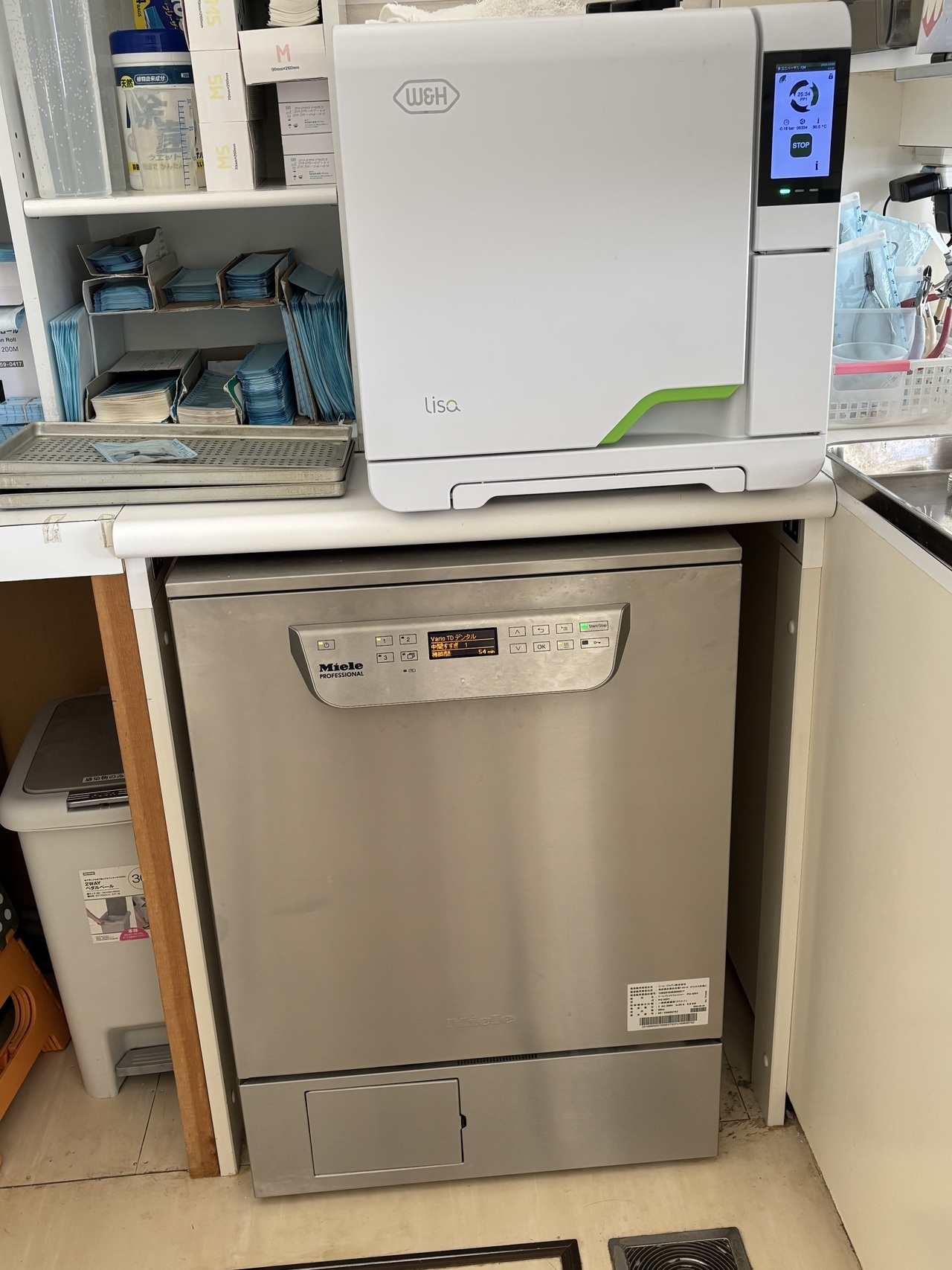 院内感染の予防・医療安全の観点から、患者さんに使用する切削器具(バー・リーマー等)および、口腔内で使用するハンドピース、バキュームチップなどの器具は、自動洗浄機やクラスB高圧蒸気滅菌(医科水準の滅菌が可能)およびガス滅菌により、一回ごとに滅菌を行っております。